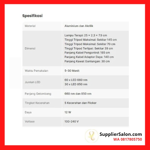 Setiap pembelian lampu terapi infrared, Anda akan mendapatkan tripod yang berfungsi sebagai penyangga. Atur panjang tripod mulai dari 70 cm hingga 145 cm agar sinar yang dihasilkan bisa menerangi kulit dengan maksimal. Ada pula gantungan yang bisa Anda pasang pada dinding jika Anda punya ruang terbatas untuk memasang tripod.