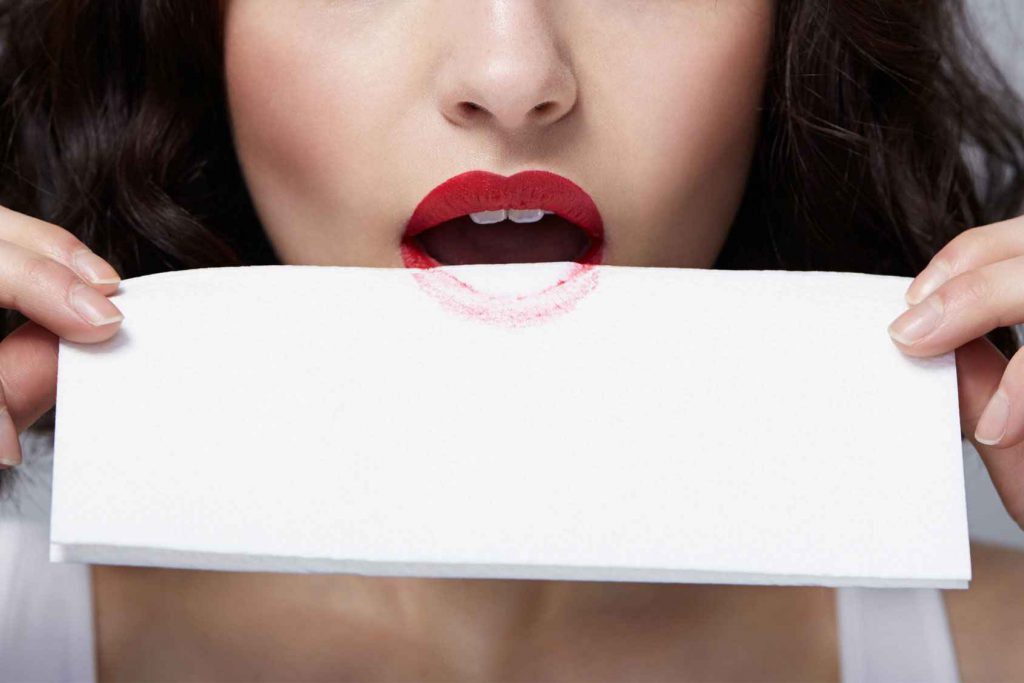 Trik pertama untuk menghindari warna lisptick mengotori gigi kamu adalah dengan menggunakan tisu. Setelah kamu memulaskan lipstick pada bibir kamu, tempelkanlah tisu pada bibir bawahmu. Kemudian, katupkan kedua bibir atas dan bawahmu sehingga sisa lipstick yang tidak menempel pada bibir dapat terangkat degan tisu.